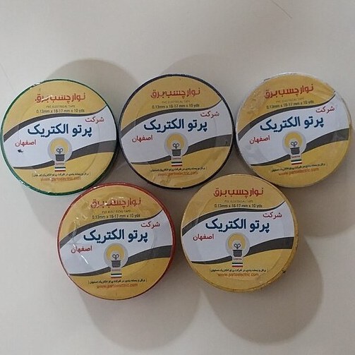 نوار چسب برق پرتو الکتریک نوار چسب ایرانی جنس درجه ۱ در رنگ های : زرد - آبی - قرمز - سفید - مشکی - سبز طول ۱۰ یارد عرض ۱۶ تعداد ۵۰۰ در کارتون